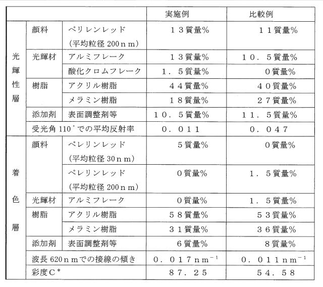 車体等にメタリック塗装がされたときに陰影感ないしは金属質感が得られるのは、塗装物を視る角度によって明度が変化するフリップフロップ性(以下、「FF性」という。)による。つまり、明(ハイライト)と暗(シェード)のメリハリが強くなるためである。しかし、ペリレンレッド等の系顔料を採用した場合、ハイライトにおいて色が明るくきらめき感をもって発現するだけでは、意匠性の高い金属調のカラーの実現という観点からすると、必ずしも十分ではない。