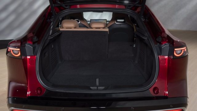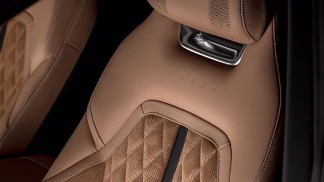 リアデザインも水平テールライトバーが目を引き、新しい「Mazda」の文字ロゴが従来のエンブレムに代わり、洗練された印象を与えます。また、電動式リアスポイラーを搭載し、見た目と高速安定性を両立しています。