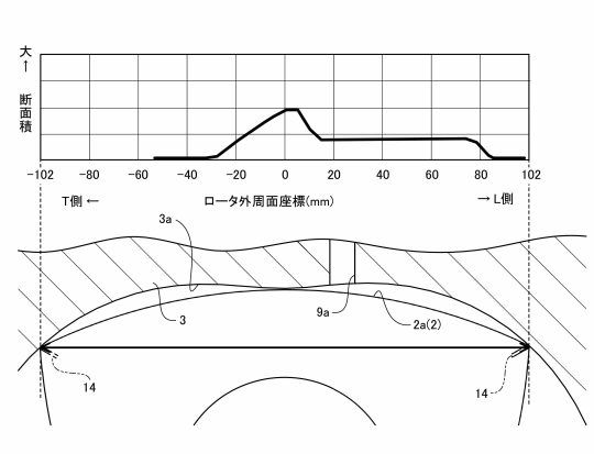 本特許では、ロータ外周面のリセス形状と点火制御の組み合わせにより、火炎の成長を適切に制御しています。リーディング側凹部(L側)を長めに設計し、中央部の断面積を最も大きくすることで、TDC(圧縮行程上死点)付近においてトレーリング側(T側)からL側への混合気の流速を抑制します。これにより、火炎の急激な成長が防がれ、燃焼が緩やかに進行します。さらにT側凹部の傾斜と長さを調整することで、二段燃焼の発生や規模を抑制し、未燃混合気の供給をスムーズにしています。点火プラグはL側に配置され、TDC前に点火することで燃焼の安定化と制御が可能となります。