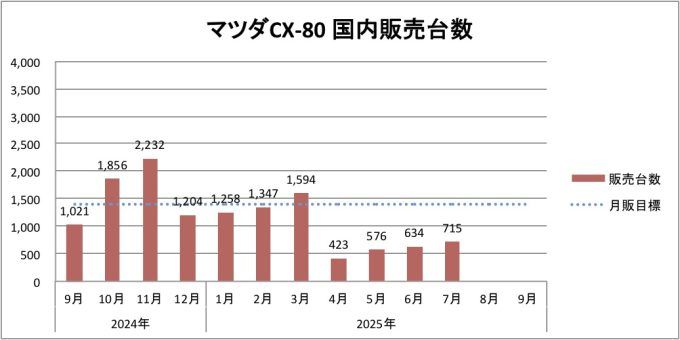 マツダは、2025年7月にCX-80を715台販売しました。久しぶりに新車販売台数ランキングに戻ってこれましたが、販売目標の約半分しか売れていませんでした。残念。